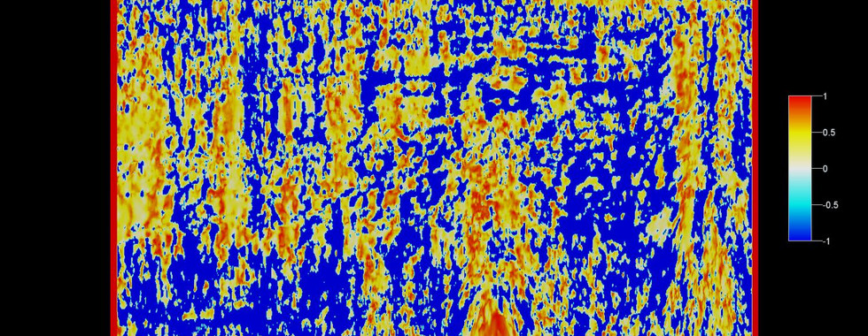 The thinned fault likelihood (TFL) was then computed. This uses the fault likelihood dataset created and creates more linear fault features. The figure below shows the thinned faults as black/ grey lines depending on their thinned fault likelihood (see the scale bar). The red regions are regions with a high fault likelihood. The difference between the broad swaths shown by the FL attribute and the narrow linear features shown by the TFL attribute is evident.